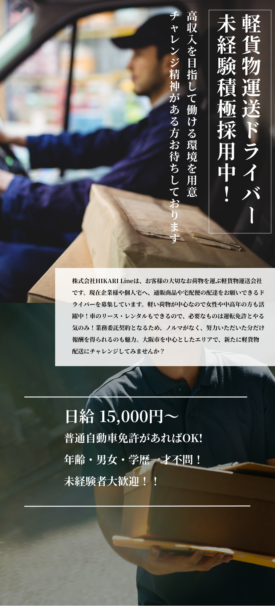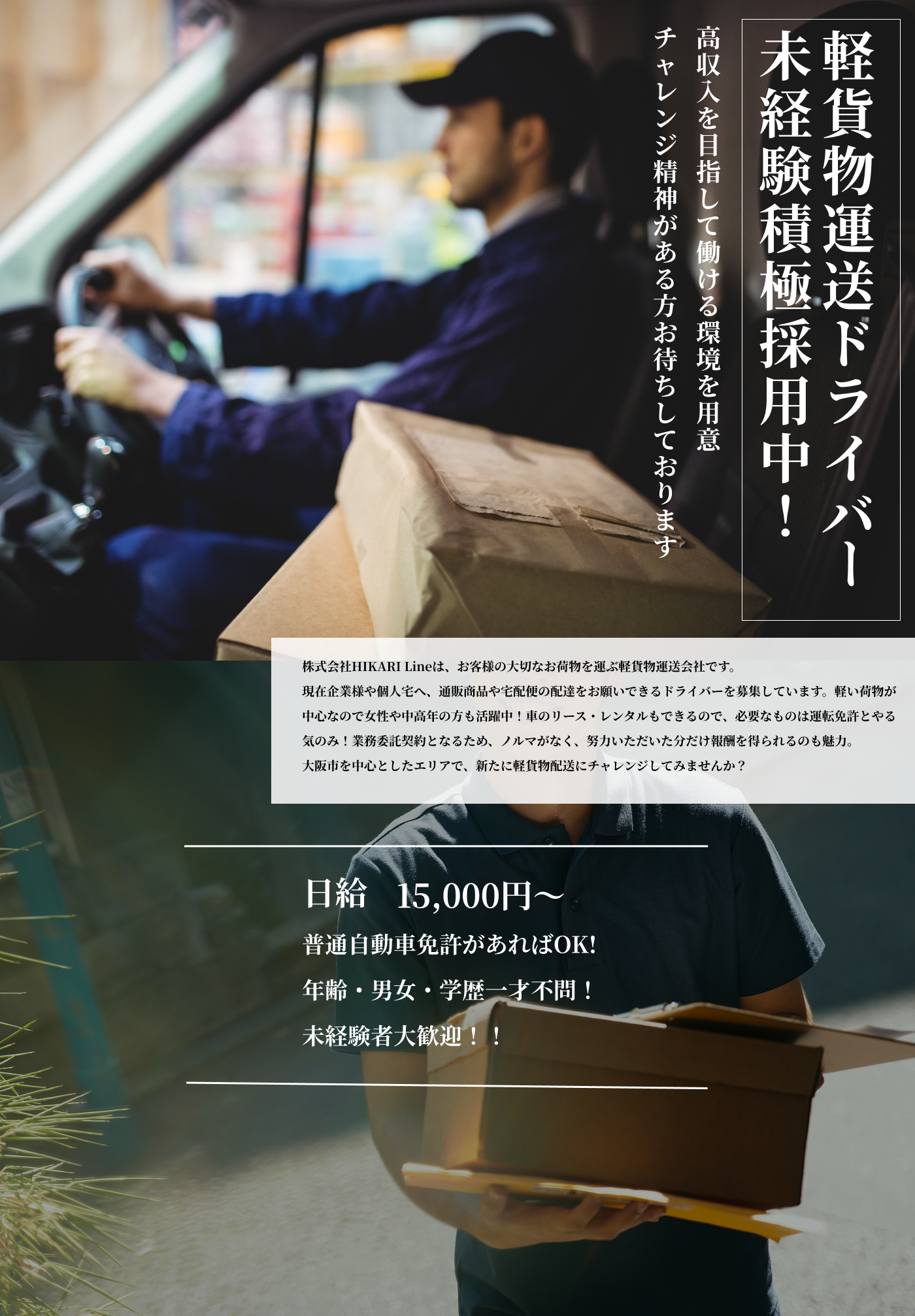 未経験者歓迎! 年齢不問・学歴不問・男女不問 ※ 経験者優遇 ※ 要普通自動車免許(AT限定可) |